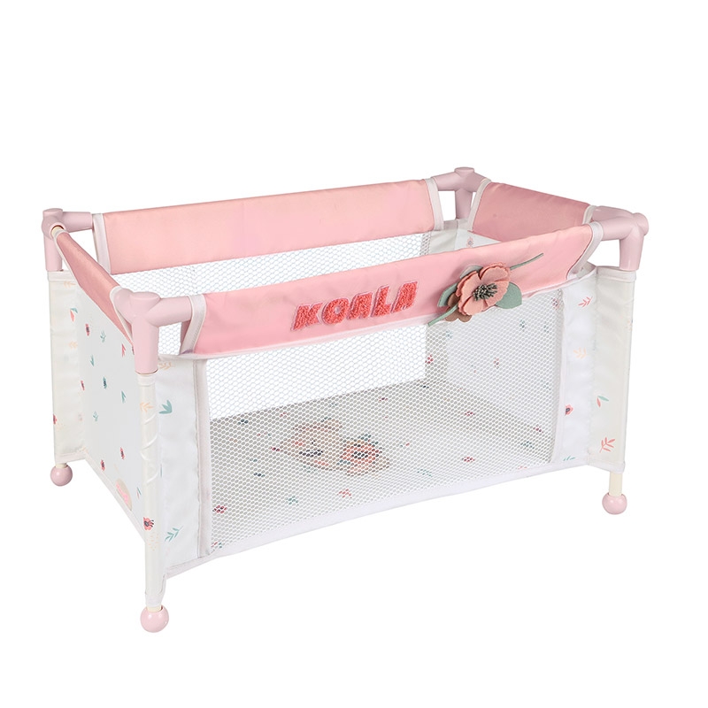 Le pack comprend : Berceau de voyage pour poupées de couleur blanc et rose avec design spécial de la ligne Koala, décorations spéciales, structure stable et sac de transport assorti.