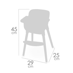 Mesures approximatives de la chaise haute : 45 cm de haut, 29 cm de large et 25 cm de profondeur.