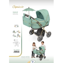 Comprend : 1 poussette de poupées Capriccio de couleur verte et noire avec ombrelle, structure pliable, plateau porte-objet inférieur, toile renforcée et lisse combinée, ton chromé sur une partie de la structure, roues avec revêtement de mousse, sac assorti avec fermeture dorée et bien plus de détails de luxe.