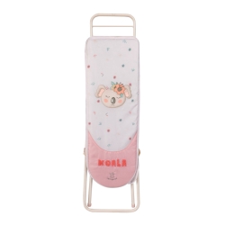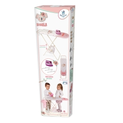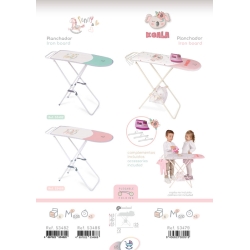 Le pack comprend : table à repasser de couleur blanche et rose avec design spécial de la ligne Koala, structure pliable, plateau inférieur en toile, un fer à repasser de jouet et 3 cintres en plastique.